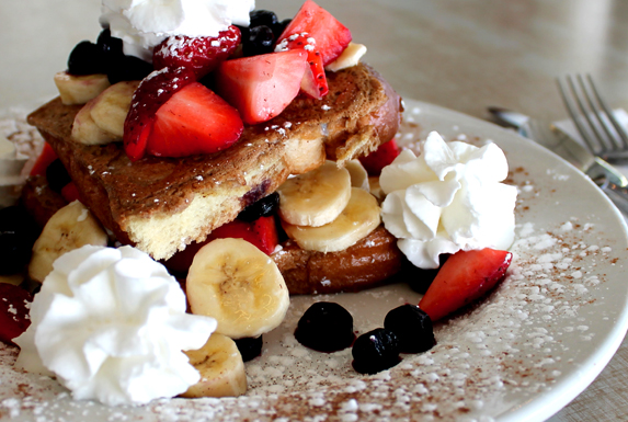 Texas Style French toast stuffed with cream cheese and fresh strawberries.