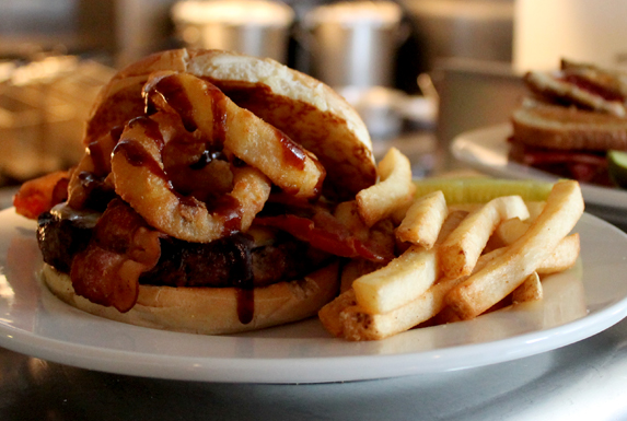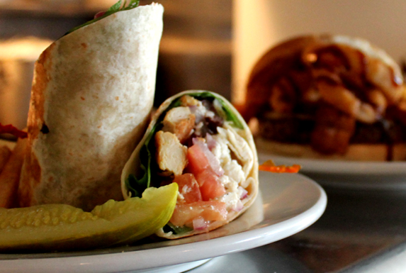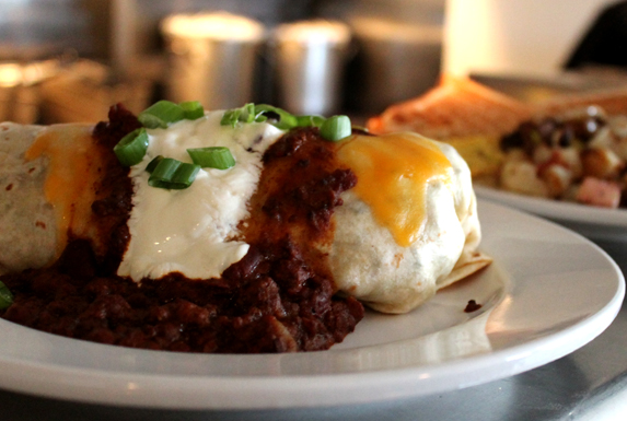 A 10” flour tortilla stuffed with scrambled eggs, peppers, onions, and cheddar jack cheese served with salsa and home fries.
